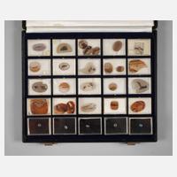 bestehend aus 25 schön gezeichneten Dendritenachaten und fünf Mondsteincabochons, in Boxen in Sammlungskassette, Maße Kassette 26 x 22 x 3,5 cm.