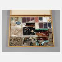 als Rohstein vorhanden: Aquamarin, Saphir, Topas, Hiddenit, Schörl, Kyanit, Granat, Apatit, verarbeitet sind vorhanden: Rubin, Koralle, Saphir, Edelopal, Mondstein, Sodalith, Lapislazuli, Malachit, Türkis, Jade, Achat und Landschaftssandstein, unterschiedliche Erhaltungen, sortiert in Boxen in Holzkassette, Maße Kassette 38,5 x 28 x 4 cm.
