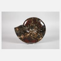 Fundort Marokko, gut sichtbare Querschnitte der zur Gruppe der Nautiloideen (Kopffüßer) gehörenden Spezies, weiterhin sind einige kleinere Ammoniten zu erkennen, beidseitig geschnitten und einseitig poliert, Maße ca. 29 x 34 x 2 cm, G ca. 3,8 kg.