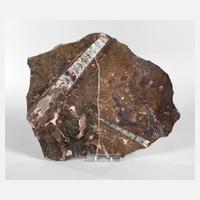 bestehend aus angeschliffener Chondritscheibe, Allende/Mexiko, ca. 25 x 28 mm, G ca. 5,3 g.; angeschliffener Chondrit, Marokko, ca. 62 x 83 x 12 mm, G ca. 75,0 g; Chondrit, Allende/Mexiko, ca. 41 x 32 x 36 mm, G ca. 51,4 g; Eisenmeteorit, Canyon Diablo/Arizona, ca. 71 x 36 x 18 mm, G ca. 90,9 g; zwei Eisenmeteoritscheibe mit ausgeprägten Widmannstätten-Strukturen, Jiquipilco/Mexiko, ca. 59 x 67 x 5 mm, G ca. 100 g und 52 x 37 x 3 mm, G ca. 28,6 g; Eisenmeteorit, Arizonakrater/Winslow/Arizona, ca. 39 x 24 x 7 mm, G ca. 14,7 g; geschliffene und lackierte Pallasitscheibe, Brenham, Kansas, ca. 74 x 45 x 9 cm, G ca. 111,5 g, teils mit leichten Korrosionsspuren.