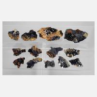 Fundort Tsumeb/Namibia, 13 Stufen von der klassischen Fundstelle, besetzt mit teils hochglänzenden Azuritkristallen, Stufengröße max. ca. 8 x 4,5 x 4 cm, G gesamt ca. 500 g.