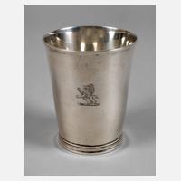 wohl 1776, Silber gestempelt mit Lion Passant für England, Stadtmarke Leopard´s Head für London, Jahreszeichen a wohl für 1776, Meistermarke CW für Charles Wright, graviertes Besitzermonogramm M D*A, Wandung mit graviertem Lion Rampant, schlichter konischer Becher mit ausschwingender Mündung, kleiner Standfuß mit Rillenbändern, geputzt, Alters- und Gebrauchsspuren, H 9 cm, G ca. 137 g.