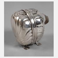 1910, Silber gestempelt Lion Passant für England, Beschaupunze London, Jahreszeichen p für 1910, Meisterpunze E & Co. für Elkington & Co., bauchige Kanne auf gedreht geripptem Fuß, volutenförmiger Holzgriff mit Resten alter Farbfassung, daran scharnierter Klappdeckel mit geripptem Rand, kleiner Deckelknauf, nach oben springender Ausguss mit Akanthuslaub, Wandung mit graviertem Drachenkopf vor gekreuzten Pfeilen und stilisierter Lilie zwischen Federn, Alters- und Gebrauchsspuren, H 19,5 cm, G ca. 366 g.