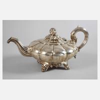 1849, Silber gestempelt mit Lion Passant für England, Beschaupunze Leopard´s Head für London, Jahreszeichen O für 1849, Meistermarke JS AS für Joseph II & Albert Savory, auf vier floralen angedeuteten Füßen stehende flache gerippte Teekanne, hochgewölbter Volutenhenkel, schmaler, nach oben geschwungener Ausguss, scharnierter Klappdeckel mit Bekrönung als Kürbispflanze, altersgemäß gute Erhaltung mit Alters- und Gebrauchsspuren, H 14 cm, G ca. 733 g.