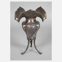 2. Hälfte 19. Jh., ungedeutete Punzen, Silber geprüft, auf drei ausgestellten schlanken Beinen, in Rokokoform schräg gerippt und mit weit gelappter Mündung, verziert mit Früchtekörben, Blütenranken, Muschelmotiven und Frauengesichtern, normale Gebrauchs- und Altersspuren, H 28 cm, G ca. 637 g.