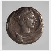 ca. 450 v. Chr., Avers Kopf der Arethusa mit Perlhaarband und umgeben von vier Delphinen nach rechts, Revers Wagenlenker in Quadriga, darüber fliegende Nike mit Kranz, Silber, D 23 mm, G ca. 16,55 g, s-ss.