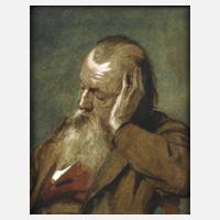 auf einem Stuhl sitzender, ein Nickerchen machender älterer Herr mit weißem Rauschebart, Aquarell und Deckfarben auf Papier, rechts unten nicht vollständig sichtbare Signatur "F. Scha...", auf Rückwand Etikett "Amsler & Ruthhardt kgl. Hofkunsthandlung Berlin W Behrenstraße 29a", leicht gebräunt, unter Glas gerahmt und hierauf Schild "Ferdinand Schauss 1868", Falzmaße ca. 22 x 18 cm. Künstlerinfo: Prof. Wilhelm Ferdinand Schauss/Schauß auch Guillaume Ferdinand Schauss, deutscher Bildnis- und Genremaler (1832 Berlin bis 1916), studierte an der Königlich Preußischen Akademie der Künste in Berlin unter Carl Steffeck, ab 1856 studierte er in Paris unter Léon Cognie, bereiste England, Holland, Belgien, Italien und Spanien, um Portraits großer Meister zu studieren, ab 1874 Professur an der Großherzoglich-Sächsischen Kunstschule Weimar bis 1876, dann zurück nach Berlin, bekannt für mythologische Szenen und Portraits. Quelle: Thieme-Becker/Vollmer, Allgemeines Lexikon der Bildenden Künstler, Verlag Seemann Henschel GmbH & Co. KG, Boetticher, Müller-Singer, Klunzinger-Seubert, Seubert, Saur, Dressler, Scheidig ”Die Weimarer Malerschule” und Wikipedia.