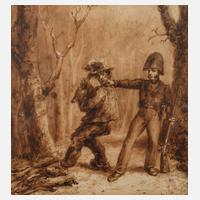 Gendarm überrascht einen Bauern beim Holzfrevel, bis ins 19. Jh. wurde Holz vor allem als Brennstoff benötigt, die unerlaubte Entnahme von Holz im Wald wurde in zahlreichen Ländern Europas im Rahmen der Forststrafrechte mit teils drakonischen Strafen geahndet, feine Tuschezeichnung in Camaieu-Technik in Sepia auf Papier, 1. Hälfte 19. Jh., links unten unscheinbar signiert "V. Delacroix", rückseitig fragmentarisch lesbares frz. Etikett "... signé a gauche [links signiert] Victor Delacroix", hinter Glas und Passepartout mit Messingrahmenschild "De La Croix, Victor" gerahmt, Passepartoutausschnitt ca. 17 x 16 cm. Künstlerinfo: auch Viktor Delacroix, belgischer Genre- und Glasmaler (1802 Brüssel bis 1868), 1829 Ehrung mit dem Grand Prix der Akademie Gent, beschickte 1829–51 Ausstellungen in Brüssel, Antwerpen und Gent, Quelle: Thieme-Becker, Saur "Bio-Bibliographisches Künstlerlexikon", Bénézit, Monogrammlexikon Nagler, Wurzbach, Immerzeel und Internet.