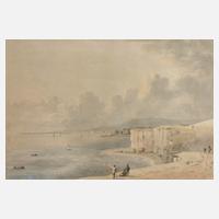 Steilküste von England mit vereinzelten Personen und Booten sowie im Hintergrund Kleinstadt vor Hügelkette, Aquarell und Tusche, um 1800, auf Rahmen Rückwand auf Etikett bezeichnet "Anthony Devis 1729-1816" und "Coast Scene", und Klebezettel mit Signatur "Anthony Devis", minimal geblichen, unter Passepartout und hinter Glas gerahmt, Passepartoutausschnitt ca. 28,3 x 41,5 cm. Künstlerinfo: engl. Landschaftsmaler und Aquarellist (1729 Lancashire bis 1816 Guildford in Surrey), 1742 in London schon als Maler verzeichnet, Teilnahme an den Ausstellungen der Free Society of Artists und der Royal Academy, das berühmte, von Wedgwood für Katharina die Große hergestellte Grüne Froschservice zeigt einige Motiv von Devis, Quelle: Thieme-Becker und Wikipedia.