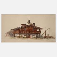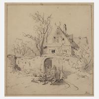 typisches oberbayerisches Bauernhaus mit Dachaufbau und Ziehbrunnen, detailreiche Darstellung mit schöner Behandlung des Lichts, Aquarell und Graphit auf Papier, um 1860, auf der Rückseite Stempel "Nachlaß F. A. Schlegel", minimal gebräunt, unter Passepartout geheftet, Blattmaße ca. 10,5 x 19 cm. Künstlerinfo: dt. Maler und Miniaturmaler (1828 Heidersdorf bei Sayda/Erzgebirge bis 1895 Dresden), 1844–48 Studium an der Dresdner Akademie bei Ludwig Richter, unternahm Studienreise nach Rom, tätig in Dresden, Quelle: Thieme-Becker, Saur "Bio-Bibliographisches Künstlerlexikon", Müller-Singer, Schülerlisten der Dresdner Akademie und Friedrich "Ludwig Richter und sein Schülerkreis".