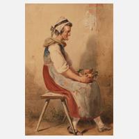 auf einem Schemel sitzende ältere Bäuerin mit einer Schale voll Beeren in ihren Händen, Aquarell über Graphit auf Papier, Ende 19. Jh., links unten Signatur in Blei "Goebel", gleichmäßig leicht gebräunt, unter Passepartout und hinter Glas gerahmt, Passepartoutausschnitt ca. 23,5 x 16,5 cm. Künstlerinfo: österr. Lithograph, Genre- u. Portraitmaler (1824 Wien bis 1899 Wien), erster Zeichenunterricht bei seinem Großvater Josef Klieber, frühzeitig an der Wiener Akademie bei Gsellhofer, gefördert durch Danhauser und Fendi, 1848 Auszeichnung mit dem „Füger´schen Kompositionspreis“, zeitweise im Atelier von Ranftl, hier Kontakt zu Fürst Alexander von Schönburg, in dessen Haus er Zeichenunterricht gibt und über den er in vornehme Kreise als Portraitmaler eingeführt wird, ab 1852 Förderung durch Graf Chambord, tätig in Graefenberg und Freiwaldau als Portraitist der feinen Kurgesellschaft, 1851 in Kiew, 1855 in Venedig, Reggio u. Piacenza, hier Bildnisaufträge des Hofes von Modena und Parma, 1860–61 in Paris, anschließend auf Einladung des serbischen Hofes in Belgrad, 1864 in Spanien und Afrika, unternahm weitere Studienreisen, tätig in Wien, Quelle: Thieme-Becker und Internet.