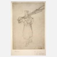 mehrere mit Bajonett bestückte Gewehre tragender Soldat mit Tornister, Bleistiftzeichnung auf Bütten, um 1820, rechts unten signiert "P Hess", minimal angeschmutzt, unter Passepartout geheftet, Blattmaße ca. 26 x 18,5 cm. Künstlerinfo: eigentlich Peter Heinrich Lambert Hess, auch Heß, ab 1861 Ritter von Hess (1792 Düsseldorf bis 1871 München), Sohn des Kupferstechers Carl Ernst Christoph Hess, Schüler seines Vaters, ab 1809 kurzzeitiges Studium an der Kunstakademie in München, weitestgehend Autodidakt, Studienreise nach Österreich, Italien und in die Schweiz, 1814 schuf er sein erstes großformatige Gemälde „Schlacht von Arcis sur Aube“, 1833 Begleitung von König Otto nach Griechenland, 1839 folgte er einer Einladung von Zar Nikolaus I. nach Moskau und St. Petersburg, anschließend Schaffung von Fresken für die Arkaden des Münchner Hofgartens, 1861 Erhebung in den Ritterstand, Quelle: Thieme-Becker, Bruckmann-Münchner Malerei des 19. Jh., Matrikeln der Münchner Akademie und Wikipedia.