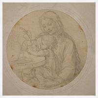 junge Mutter, liebevoll ihr Kind fütternd, mit spitzem Stift ausgeführte Zeichnung, Graphit auf Papier, Mitte 19. Jh., das runde Papier fest auf Unterlagekarton montiert und hierauf signiert oder bezeichnet "C Lossow", vornehmlich im Randbereich braunfleckig, D Zeichenblatt ca. 10,7 cm. Künstlerinfo: deutscher Historienmaler und Zeichner (1835 München bis 1861 Rom), Schüler seines Vaters, ab 1851 Studium an der Akademie in München bei Philipp von Foltz, Beeinflussung durch Moritz von Schwind und Andreas Müller, 1856 auf Reise nach Norditalien Bekanntschaft mit dem Erbprinzen von Meiningen Georg II., dieser verschaffte ihm einige Aufträge, Aufgrund seines Todes mit nur 25 Jahren sind wenige Arbeiten bekannt, Quelle: Thieme-Becker, Allgemeine Deutsche Biographien, Matrikeln der Akademie in München und Wikipedia.