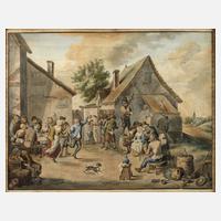 Gesellschaft beim ausgelassenen Feiern auf einem Bauernhof, wohl in Anlehnung an Arbeiten von David Tenier den Jüngeren, Aquarell und Deckfarben auf Papier, rechts unten signiert und datiert "J. Maas fecit 1840", auf Unterlagepapier montiert, etwas gegilbt und braunfleckig, hinter Glas gerahmt, Blattmaße ca. 39,5 x 50,5 cm.