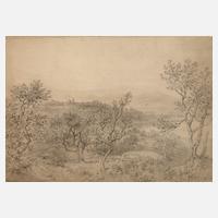 Blick über vereinzelte Olivenbäume zu einer auf einem Hügel gelegenen Stadt und im Hintergrunde die Silhouette einer Bergkette, mit zahlreichen Grautönen ausgeführte Landschaftszeichnung, Bleistift auf leichtem Karton, um 1860–70, links unten signiert "G. Osterwald", Papier gleichmäßig leicht gegilbt und minimal fleckig, rückseitig Spuren alter Montierung, unter Passepartout montiert, Blattmaße ca. 26,5 x 37 cm. Künstlerinfo: eigentlich Georg Rudolf Daniel Osterwald, dt. Maler, Graphiker, Illustrator und Lehrer (1803 Rinteln bis 1884 Köln), als technischer Zeichner tätig, Studium der Malerei an der Friedrich-Wilhelms-Universität in Bonn, ab 1825 Studium an der Akademie in München bei Friedrich von Gärtner, hier auch als Zeichenlehrer an der Baugewerkschule tätig, 1830–32 in Paris ansässig, 1835–36 Herausgeber der Hannoverschen Kunstblätter, war auch in Dresden und Köln ansässig, 1864 Ernennung zum Professor, Quelle: Thieme-Becker, Matrikeln der Münchner Akademie und Wikipedia.