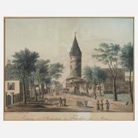Blick auf die Bockenheimer Warte in Frankfurt am Main mit Figurenstaffage, unter der Darstellung betitelt "Eingang von Bockenheim bei Frankfurt am Main", Tusche und Aquarell auf Papier, unterhalb der Darstellung links bezeichnet "Nach der Natur gez. v. F. A. Ramadier 1830", fleckig, im unteren Bereich Einriss und im Passepartoutausschnitt gebräunt, unter Passepartout und hinter Glas gerahmt, Darstellungsmaße ohne Schrift ca. 23,2 x 31,2 cm. Künstlerinfo: dt. Zeichner und Aquarellist (1790 bis ca. 1834 Frankfurt am Main), auch als Zeichner für Druckvorlagen tätig, Quelle: Thieme-Becker und Internet.