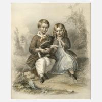 in einem herrschaftlichen Park sitzt ein Geschwisterpaar, der Junge hat ein kleines Hündchen auf dem Schoß, sehr feine Malweise, Mischtechnik über Blei auf Papier, rechts unten signiert "Otto Schneider" sowie datiert "1851", rückseitig nochmals künstlerbezeichnet sowie mit Annotationen zu den Dargestellten: "Hans Krieger * 21.5.1847" und "Hedwig Krieger * 15.1.1849", spätere "Girschner", in prächtiger goldfarbener Leiste hinter Glas gerahmt, Darstellungsmaße ca. 35,5 x 39,5 cm. Künstlerinfo: dt. Maler, tätig im 19. Jh.