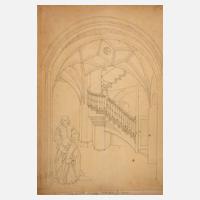 von oder nach Edward von Steinle, Titel laut "Des Meisters Gesamtwerk in Abbildungen" "Betergruppe in der St. Leonhardskirche zu Frankfurt a. M.", zwei betende Männer in prächtiger Kleidung der Renaissance, in einer gotischen Kirche mit aufwendig gestalteter Freitreppe, Bleistift auf hauchdünnem Papier und auf leichtem Karton kaschiert, unterhalb der Darstellung in Blei bezeichnet "Die Figuren von E. Steinle 1848 – "Betergruppe" – No. 304 Steinle´s Gesamtkunstwerk", gleichmäßig leicht gebräunt und etwas fleckig, unter Passepartout geheftet, Blattmaße ca. 40,4 x 27,9 cm. Künstlerinfo: auch Eduard von Steinle, österr. Maler und Zeichner (1810 Wien bis 1886 Frankfurt am Main), Studium an der Akademie in Wien, 1828–33 in Rom ansässig und hier Kontakt zu Philipp Veit und Friedrich Overbeck, anschließend wieder in Wien ansässig, in München erlernte er die Freskotechnik, 1850 Ernennung zum ersten Professor am Städelschen Institut in Frankfurt am Main, Ausführung zahlreicher Wandmalereien in bedeutenden öffentlichen Räumen, 1879 Erhebung in den österreichischen Ritterstand, Quelle: Thieme-Becker, Österreichisches Biographisches Lexikon, Wurzbach und Wikipedia.