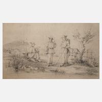 an einem kleinen Tümpel in ländlicher Umgebung sitzender Künstler beim Zeichnen und neben ihm zwei weitere Maler im Gespräch, mit gekonntem Strich angelegte Zeichnung, Graphit auf Papier, um 1820, minimal fleckig, unter Passepartout montiert und hier Zuschreibung "Max J. Wagenbauer", Blattmaße ca. 12 x 19,3 cm. Künstlerinfo: auch Wagenbaur, dt. Landschafts- und Tiermaler, Zeichner und Lithograph (1775 Öxing bei Grafing bis 1829 München), Schüler der Münchner Zeichenakademie bei Johann Jakob Dorner dem Älteren und Christian von Mannlich, 1801 kurfürstliche Künstlerpension, ab 1800 intensive Beschäftigung mit der Lithographie, zeitweise als Zeichenlehrer der Familie des Grafen Lodron auf Schloss Haag an der Ammer tätig, ab 1802 in München ansässig, 1802 zum kurfürstlichen Hof- und Kabinettszeichner ernannt, gefördert von König Maximilian I., zunächst Aquarellmaler, ab 1810 Hinwendung zur Ölmalerei, 1811 Mitausmalung des Speisesaals von Schloss Nymphenburg, 1815 königlicher Galerie-Inspektor, Mitglied der Akademien Berlin, Hanau und München, Quelle: Thieme-Becker und Internet.