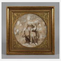 die auf Wolken thronende Gottesmutter zwischen zwei Engeln, Aquarell und Bleistift auf Papier, Anfang 19. Jh., Papier ungleichmäßig gebräunt, hinter Glas im vergoldeten Empirerahmen (gering bestoßen) mit rundem Bildausschnitt von D ca. 33,5 cm, Falzmaße ca. 37,5 x 37,5 cm.