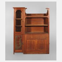 Ausführung Schöttle´s Möbelfabrik Stuttgart, um 1900, Eiche massiv, mittelbraun gebeizt, bestehend aus Bücherregal und einer Säulenvitrine, die Säulen des Regals verziert mit geschnitzten Adlerköpfen, seitlich eine Tür mit originalem Messingbeschlag in Form einer Krone, die untere Tür der Säulenvitrine mit feinem Floraldekor im Xylektypom-Verfahren, Schlüssel fehlen, unrestaurierter Originalzustand, ein Adlerkopf gebrochen und lose beigegeben, Maße Vitrine 182 x 48 x 36 cm, Regal 179 x 99 x 31 cm. Herstellerinfo: In der Zeit des Jugendstils produzierte und vertrieb die Möbelfabrik Schöttle als fortschrittlicher Hersteller Möbel, die nach dem von der Möbelfabrik J. Buyten und Söhne in Düsseldorf erfundenen Xylektypom-Verfahren hergestellt wurden, durch das Verfahren konnten Füllungen maschinell mit attraktiven Holzmaserreliefs verziert werden, bedeutende Künstler lieferten Entwürfe für Xylektypom-Möbel, so Hans Eduard von Berlepsch-Valendas und Bernhard Pankok. Quelle: Internet.