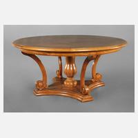 um 1905, Kirschbaum auf Nadelholz furniert, runde sternförmige, furnierte Platte mit profiliertem Rand, getragen von Balusterfuß und vier geschwungenen Beinen, jeweils in Voluten endend, vierpassig geschweifter getreppter Sockel, Gestell mit Alters- und Gebrauchsspuren, die Platte in gutem Zustand, vermutlich restauriert, H 75 cm, D 160 cm.
