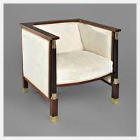um 1903, Mahagoni furniert, teilweise ebonisiert, geometrische Intarsie aus Messing, fast würfelförmiger Sessel, auf Vierkantfüßen mit Messingmanschetten, Front mit ebonisierten Vollsäulen, die Lehne mit fünf intarsierten Rautenmotiven, Polster und Bezug erneuert, wohnfertig restauriert, Bezug minimal fleckig, sonst guter Zustand, Maße 74 x 70 x 70 cm. Quelle: Langenwiesche, Hans Christiansen Leben und Werk, S. 260, Variante mit selbem Dekor, ohne Säulen.