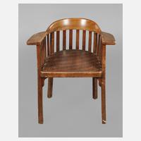 deutsch, um 1900, Gestell aus massiver Buche, dunkelbraun gebeizt, umlaufende Armlehne, fließend in die Vorderbeine übergehend, alter, vermutlich nicht originaler Stoffbezug, normale Gebrauchsspuren, Maße 76 x 57 x 55 cm.