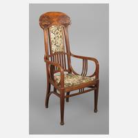 Italien, um 1904, in der Zarge monogrammiert V.M.1904, Gestell aus massiver Eiche, trapezförmige Sitzfläche, gerahmt von schlanken Armlehnen, welche fließend in die hohe Lehne übergehen, diese verziert mit floraler Oberflächenschnitzerei, alt restauriert, Bezug erneuert, Maße 126 x 57 x 54 cm.