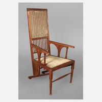 Model 330, Entwurf um 1902, Ausführung J & J Kohn, Tetschen/Austria, Eiche und Schichtholz schwarz gebeizt, in der Zarge mit Brandstempel gemarkt, die hohe Lehne im eleganten Schwung in die Sitzfläche übergehend, die Rückseite der Lehne mit gebogenem Schichtholz verkleidet, originale Messingziernägel, die Füße mit Messingschuhen, Lederbezug erneuert, sonst guter Originalzustand, lediglich im Rücken kleinere Trocknungsrisse, H 99 cm, SH 47 cm. Info: ein Exemplar dieses Stuhles befindet sich im Victoria & Albert Museum London.