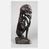 Tansania, 20. Jh., der Volksgruppe der Makonde zugeordnet, schweres dunkles Wurzelholz, stark abstrahiertes männliches Fabelwesen mit Vogelhaupt, über profilierter Plinthe, Altersspuren, H 35 cm.