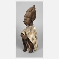 wohl Haiti, 20. Jh., dunkles Tropenholz beschnitzt, in abstrahierender Formsprache gestaltete Sitzfigur mit angezogenen Knien und stark stilisierten Gesichtszügen, bekleidet mit Gewand aus hellem Leinen, verziert von Kaurischnecken, Altersspuren, partiell alt repariert, kleine Substanzverluste, H 48 cm.