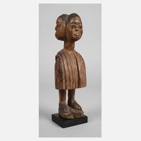 Elfenbeinküste, um 1900, der Volksgruppe der Dan zugeordnet, leichtes Hartholz, dunkel gefasst, plastische Darstellung einer stehenden unbekleideten Frau mit Narbentatauierungen, ringförmig gestaltetem Halsbereich und aufwendig gestalteter Frisur, ein Fuß fehlt, schöne Alterspatina, auf späterem Sockel montiert, H gesamt 27,5 cm.