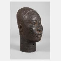 Benin/Nigeria, 20. Jh., der Volksgruppe der Yoruba zugeordnet, Bronze gegossen, bräunlich patiniert, männliches Haupt im Ife-Stil, das als der spirituelle Geburtsort des Yoruba-Stammes gilt, das Gesicht ist vertikal tatauiert, die helmartige Kopfbedeckung von Rosette und Flechtband bekrönt, H 28 cm.