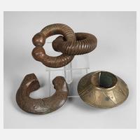 20. Jh., aus dunkler Irdenware gefertigtes bauchiges Gefäß für Wasser oder Pombe, glasiert und mit vertikalen Profilierungen verziert, dazu zwei schwere Halbreifen aus patinierter Bronze in schlichtem Dekor, unterschiedliche Maße und Erhaltungen, H max. 24 cm.