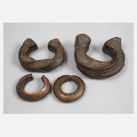 Westafrika, 19./20. Jh., vier Stück, Bronze bräunlich patiniert, Primitivgeld in verschiedener Form, teils aufwendig ornamental verziert, Altersspuren, L max. 13 cm.