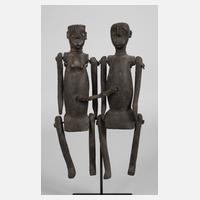 Tansania, 20. Jh., der Volksgruppe der Nyamwesi zugeordnet, Holz mehrteilig geschnitzt, beweglich montiert und dunkel gefasst, verziert von Kupferdraht, sitzendes, durch ein Band miteinander verbundenes Paar, als Hochzeitsgeschenk für frisch Vermählte gefertigt, Altersspuren, auf modernem Metallsockel, H ca. 35 cm.