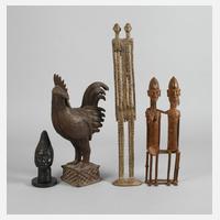 20. Jh., Bronze gegossen, teils dunkel patiniert, nach traditionellem Vorbild gefertigtes Kopfstück, dazu plastisch gearbeiteter Hahn auf Sockel in Flechtoptik, dazu zwei Paardarstellungen in teils stark abstrahierender Formensprache, unterschiedliche Maße und Erhaltungen, H max. 51 cm.