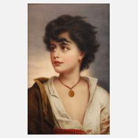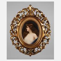 um 1900, im Motiv seitlich links signiert Wagner (wohl Franz Wagner, 1894–1908 für die Porzellanmanufakturen in Wien und Berlin tätig), Pressmarke ab 1825, weitere Prägezeichen durch Rahmung verdeckt, ovale, leicht gewölbte Porzellanplatte mit äußerst feiner polychromer Bemalung, Bruststück einer Jugendstilschönheit mit langem wallenden Haar und angedeutetem Gewand vor dunklem Grund, nach einem Gemälde des italienischen Malers Angelo Asti (1847–1903), in breitem vergoldeten Florentiner Rahmen mit rückseitigem Sichtfenster für die Marke, Rahmen alt restauriert, sonst sehr guter Zustand, Maße Falzmaße 22,5 x 16,5 cm, Maße max. 48 x 38 cm. Quelle: Bergmann, 1350 Gemälde auf Porzellanplatten, S. 110, Abb. 323.