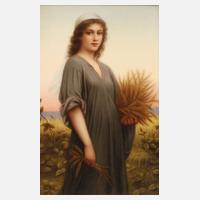 Hohenberg, 1935, links unten signiert und datiert Th.(eodor) Kob 1935., Lauschaer Porzellanmaler (1868-1948), Pressmarke 1865-1920, Prägenummer 341 und Händleretikett J. B. Klein Leipzig, hochrechteckige Porzellanplatte mit feiner polychromer Bemalung, Kniestück einer jungen Ährenleserin in Landschaft bei Dämmerung, nach Gemäldevorlage des französischen Malers Charles Landelle (1821-1908), in breiter Leiste der Zeit gerahmt, guter altersgemäßer Zustand, Falzmaße 23,5 x 16 cm, Maße max. 33 x 25,5 cm. Quelle: Bergmann, 1350 Gemälde auf Porzellanplatten, S. 167, Abb. 494.