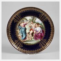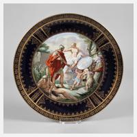 "Venus zeigt Aeneas die Waffen des Vulkan", unterglasurblaue Bienenkorbmarke um 1900–1927, Pinselnummer 30 cm/1550 und weitere undeutliche Nummer, Coupe-Form mit königsblau glasiertem Teilfond, Tondo mit mythologischer Szene in polychromem Kupferumdruck, nach einer Gemäldevorlage des italienischen Malers Pompeo Girolamo Batoni (1708–1787) sowie reicher ornamentaler Golddekoration und Goldrand, Wandaufhängung aus Draht, Motiv am Rand minimalst berieben, guter altersgemäßer Zustand, D 30 cm. Quelle: Bergmann, 1350 Gemälde auf Porzellanplatten, S. 180, Abb. 533.