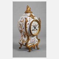 2. Hälfte 19. Jh., Porzellankorpus allseitig reich verziert mit goldstaffierten Rocaillereliefs, polychromer Aufglasurbemalung als schauseitige Amorette, seitlichen Trophäen, Blumenbuketts und Blumenzweigen sowie vergoldeten Bronzebeschlägen an den Kanten, farbig emailliertes Ziffernblatt mit weiterem Puttenmotiv, Pendulenwerk der Firma Vincenti mit Prägestempel "MEDAILLE D`ARGENT VINCENTI 1855", funktionstüchtig, kleine Emaillefehlstelle bei der "3", ein Fuß etwas verbogen und Goldränder teils berieben, sonst guter altersgemäßer Zustand, dazu Schlüssel, H 30,5 cm.