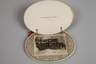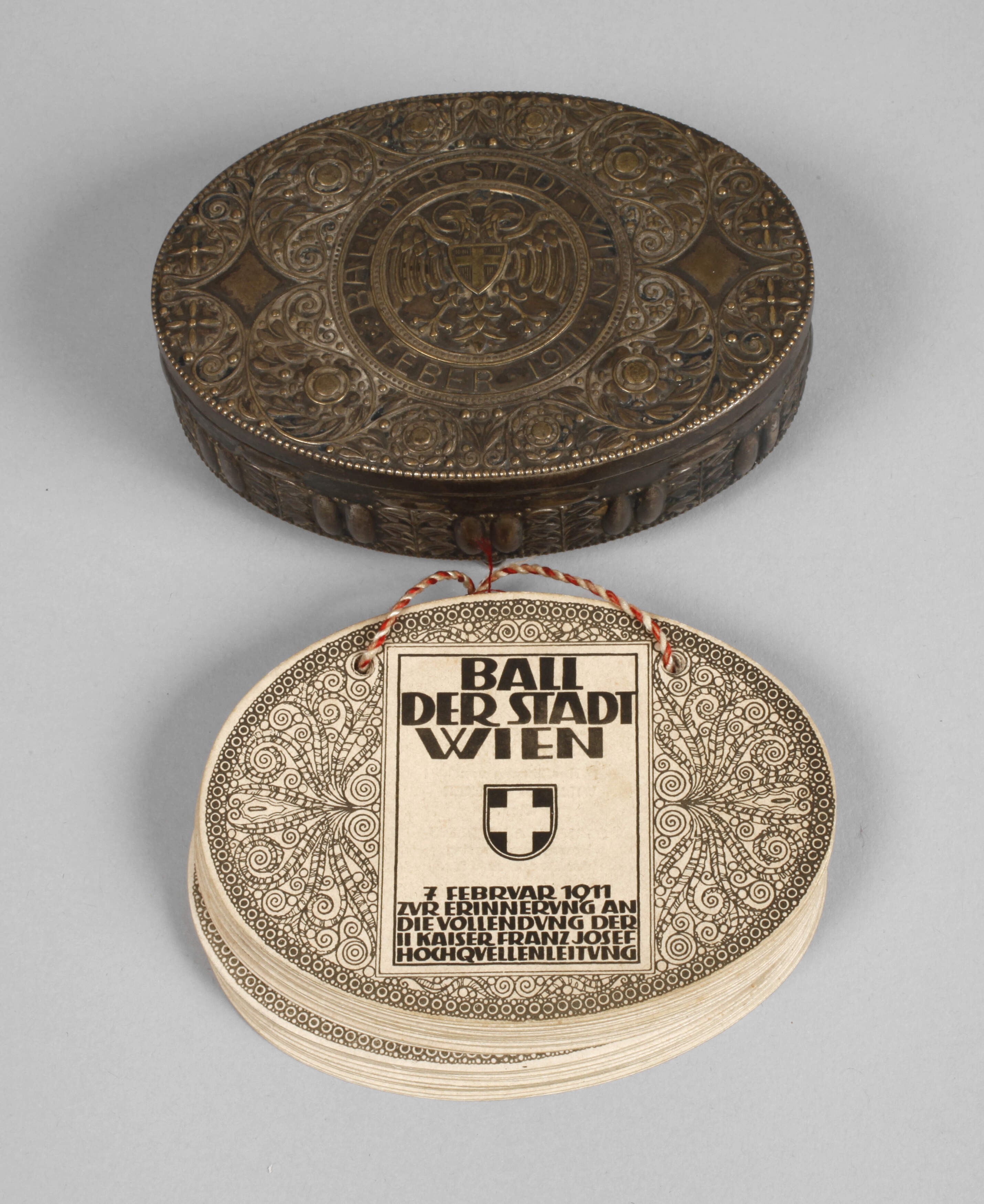 datiert 1911, Entwurf Remigius Geyling, Ausführung Wilhelm Melzer, Messingblech versilbert und vergoldet, zum Andenken an den Ball der Stadt Wien, zur Erinnerung an die Vollendung der II. Kaiser Franz Josef-Hochquellenleitung, eingelegtes Büchlein mit Fotografien rund um die Entstehungsgeschichte des Aquädukts sowie Ablauf der Tänze, Altersspuren, L 10,8 cm.