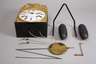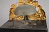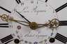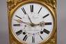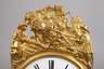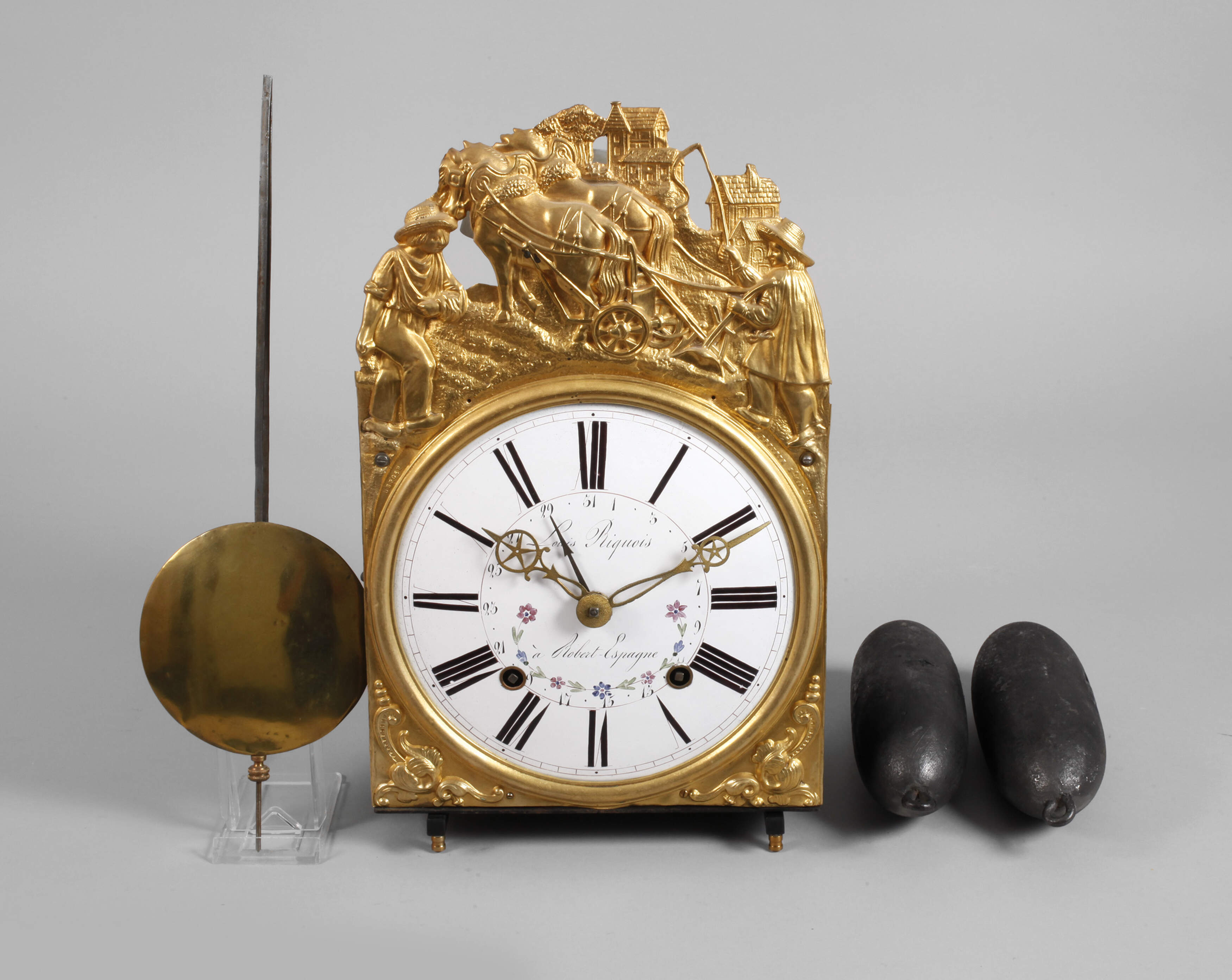 Frankreich, Mitte 19. Jh., Eisengehäuse mit Front aus geprägtem vergoldeten Messingblech, makelloses Emailleziffernblatt mit römischen Ziffern, Datumsanzeige und farbig gemaltem Blütenkranz, Werk mit Spindelhemmung und zwei Gewichten, Halbstundenschlag auf Glocke, mit Pendel und Stuhl, gehfähig, H Gehäuse 40 cm.