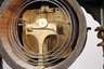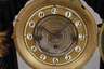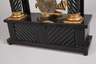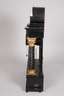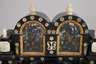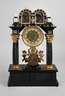 um 1870, Holz geschwärzt, partiell vergoldet, Portal mit zwei gedrehten Spiralsäulen, geschnitzte Perlmuttauflagen, mittig zwei verglaste Schreine mit verspiegelter Rückwand und feinem Blütenarrangement, rechteckiges Pendulenwerk mit Viertelstundenschlag auf zwei Tonfedern, Grande Sonnerie, im Sockel ehemals eine Walzenspieldose mit Auslösung zur vollen Stunde (fehlt), Schlagwerk mit Repetition, Gehwerk überholungsbedürftig, H 61 cm.