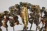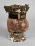 19. Jh., bezeichnet S. Felicidez, getreppter goldbronzierter Rundfuß mit montiertem, fragmentarisch erhaltenem Totenschädel, bekrönt von samtenem Kopfschmuck mit gesticktem Christusmonogramm, dekoriert von Goldlitze und Perlen, Erhaltungsmängel, H 25 cm.