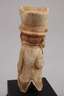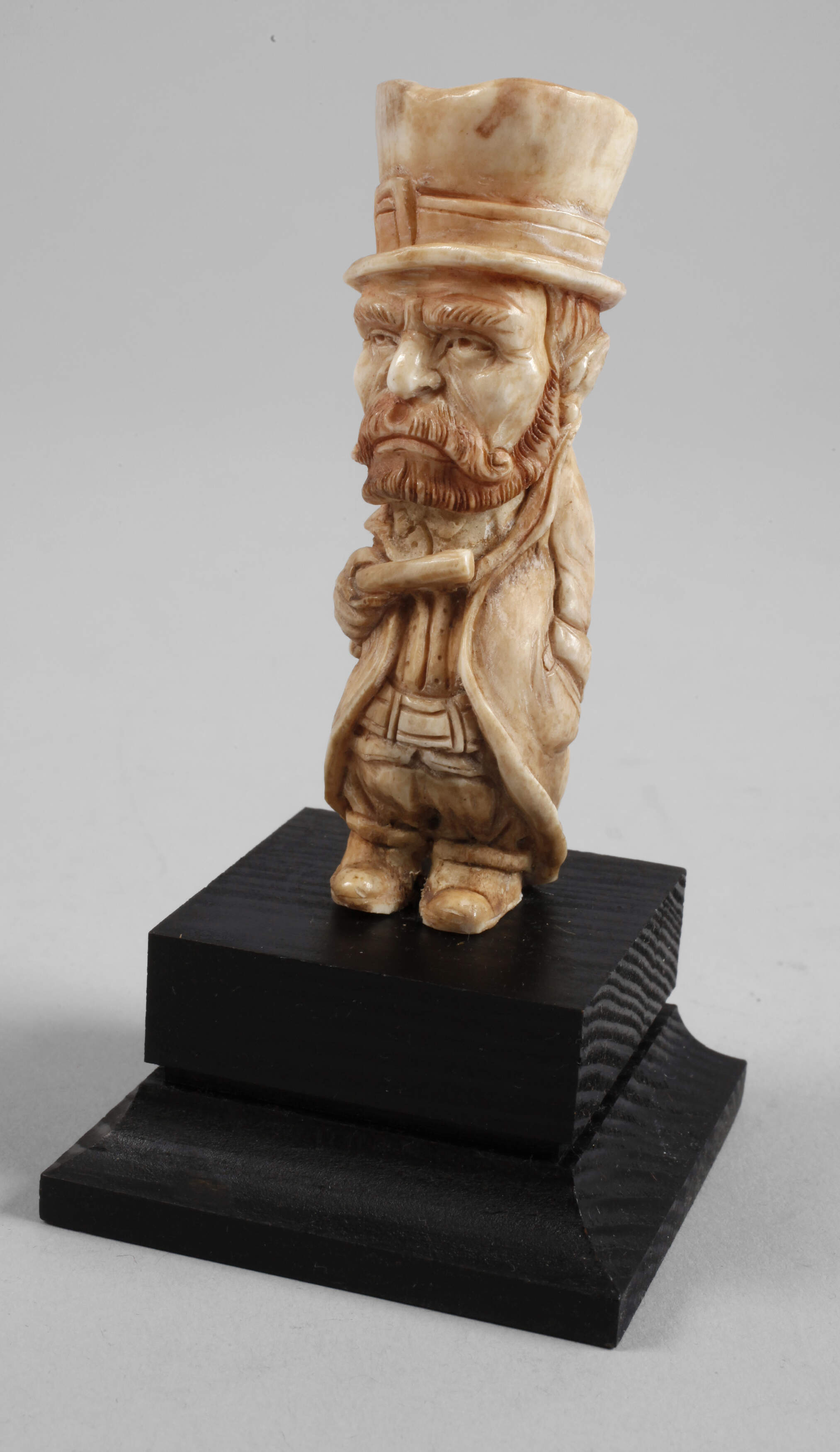 nzl., Horn beschnitzt, plastisch in Form eines missmutig dreinblickenden stehenden Kobolds mit Zylinder gestaltet, auf geschwärztem Holzsockel montiert, H 11,5 cm.