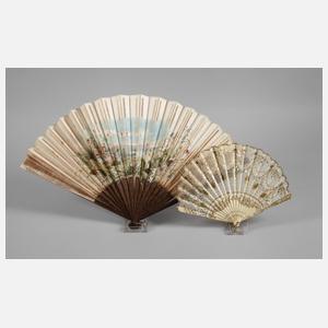 Anfang 20. Jh., einer mit Gestänge aus Bein, dieses durchbrochen gearbeitet sowie versilbert bzw. vergoldet, Bespannung aus Chiffon, verziert von Pailletten und Perlchen, im originalen Pappetui gemarkt Rud. Gollhard, Frankfurt, dazu Modell aus Edelholz mit textiler Bespannung, diese mit gemaltem Kindermotiv in Landschaft, Lagerungsspuren, im originalen goldgeprägten Pappetui, Altersspuren, L 21 und 35 cm.
