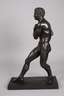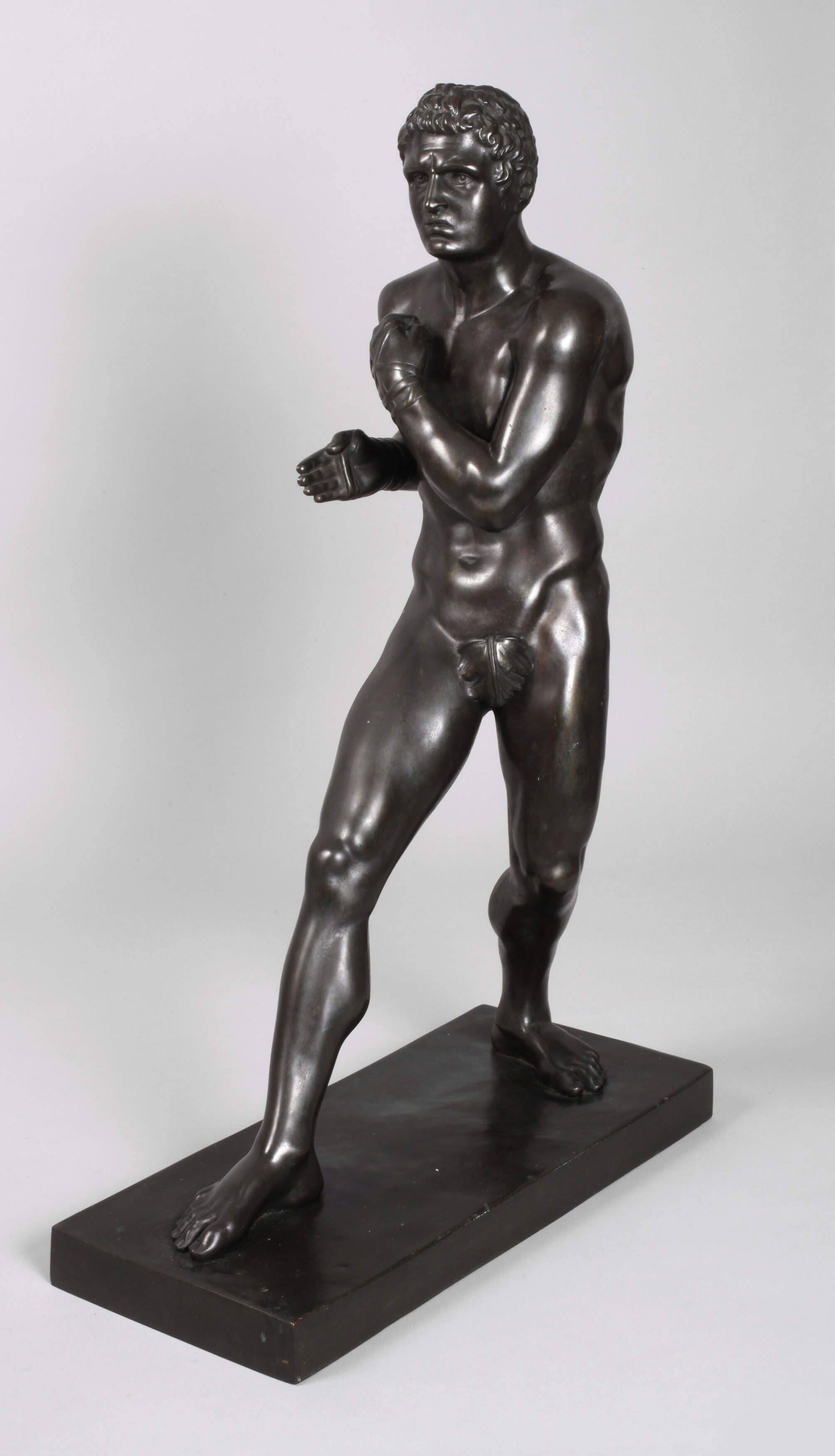 um 1900, Bronze dunkel patiniert, auf dem Sockel Gießerstempel Oskar Gladenbeck G.m.b.H., Darstellung des antiken Faustkämpfers, Teil eines Paars aus dem Dargestellten und seines Kontrahenten Creugas, diese kämpften der Überlieferung nach bei den Nemeischen Spielen einst im traditionellen Wettkampf und zwischen beiden konnte im Kampf kein Sieger klar festgestellt werden, daraufhin wurde von den Kampfrichtern beschlossen, dass beiden jeweils ein Schlag auf das Haupt zugestanden würde, um den Gegner außer Gefecht zu setzen, da Creugas bei diesem Unterfangen nicht erfolgreich war, kam Damoxenos zum Zuge, dieser stieß dem Gegner die Hand durch das Bauchfell und riss ihm die Eingeweide aus dem Bauch, man sieht ihn hier kurz vor dem Schlag, auf langrechteckiger Plinthe, guter altersgemäßer Zustand, H gesamt 66 cm. Info: Die originalen Skulpturen von Creugas und Damoxenos von Antonio Canova befinden sich in den Vatikanischen Museen in Rom. Quelle: Internet.