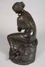 1. Hälfte 19. Jh., recto signiert Cumberworth und J(ean)., B(aptiste). Marchard (wohl der Gießer oder Hersteller), da das Stück wohl einst ein Teil einer Kaminuhr war, Bronze dunkelbraun patiniert, sitzende junge Frau, einen Vogel an ihre Brust drückend, auf naturalistischer Plinthe, normale Altersspuren, partiell minimal berieben, H 41 cm. Künstlerinfo: französischer Bildhauer (1811 Verdun bis 1852 Paris), studierte ab 1829 an der Pariser Ecole des Beaux Arts, beschickte den Pariser Salon 1833-1848 mit Bildnisbüsten und Genrestatuetten, seine Skulpturen werden in verschiedenen Museen in Europa ausgestellt. Quelle: Thieme-Becker, Vollmer, Allgemeines Lexikon der Bildenden Künstler, Verlag Seemann Henschel GmbH & Co. KG.